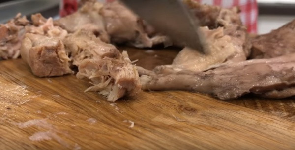 2. Сваренное мясо перекладываем в тарелку и ждём пока остынет. Морковь и лук, которые варились – выкидываем, они нам больше не пригодятся. Фасоль оставляем в кастрюле. Остывшее мясо нарезаем на кусочки, которые Вам нравятся и отправляем их снова в кастрюлю.