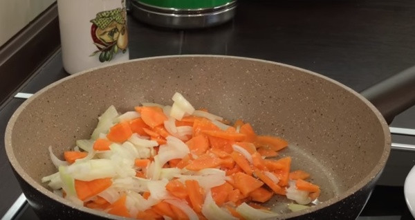 5. Нарезаем крупно морковь и лук, и отправляем овощи также тушиться на другой сковороде. Присолите их.
