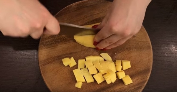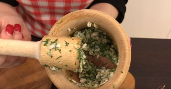 9. Займёмся традиционной заправкой для борща. В ступу давим чеснок в чесночнице (резать не рекомендуется), нарезаем мелко укроп и очень мелко – сало. Перетираем всё это.