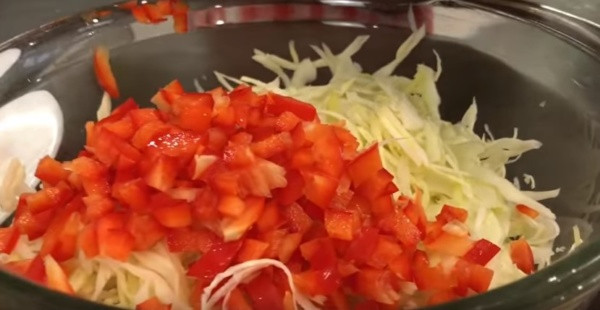 7. Шинкуем капусту и нарезаем маленькими кубиками болгарский перец. Складываем всё в одно блюдо.