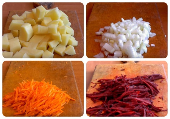 1. Первым делом ставим на плиту кастрюлю с водой. Пока греется жидкость занимаемся овощам. Всё чистим и промываем. Картофель нарезаем средним кубиком. Морковь и свеклу натираем на крупной тёрке. Лук крошим мелким кубиком. Также если у Вас свежие грибы, заранее отварите их.