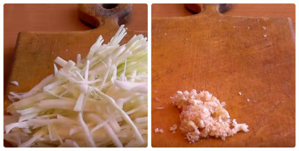 3. Капусты примерно понадобится 300 г, её мелко шинкуем. Также, для простоты действий, можно воспользоваться шинковкой. Сильно мельчить овощ не стоит. Чеснок следует мелко нарубить, либо же можно будет его пропустить через пресс уже в самом конце.