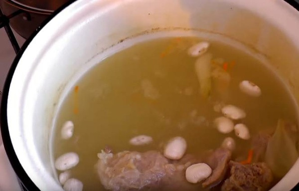 4. После закипания бульона, на поверхности образуется пенка, её надо обязательно снять иначе борщ получится мутным и будут попадаться плёночки. Далее отправляем в кастрюлю фасоль. Её необходимо заранее замочить (на ночь). Если же Вы этого не сделали, то всыпайте бобы к мясу в самом начале готовки и варите на протяжении 1,5-2 часов. Или используйте консервированный продукт.