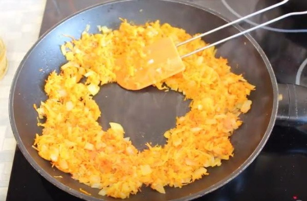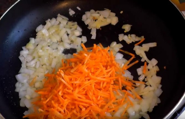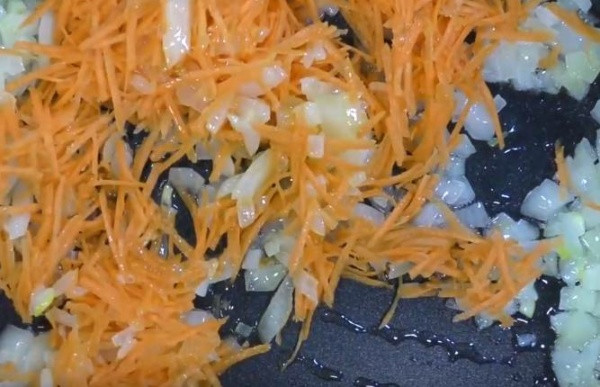 5. Тем временем ставим на плиту сковороду и наливаем в неё растительное масло. Пассеруем лук и морковь до готовности. Овощи должны приобрести золотистый оттенок. Лучше всего вначале обжарить до румяности лук, а потом добавить морковь. Перекладываем готовую пассеровку в отдельную тару.