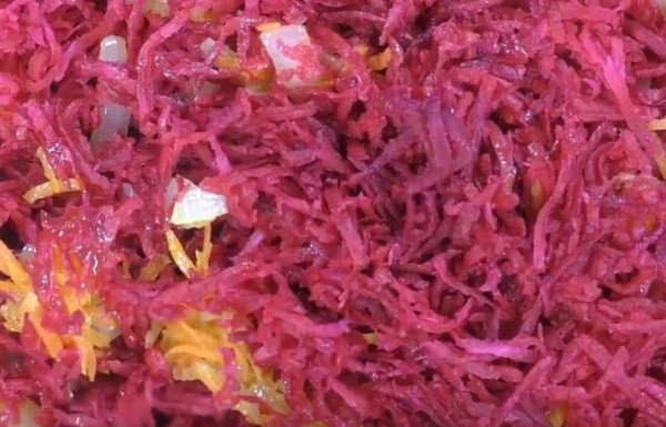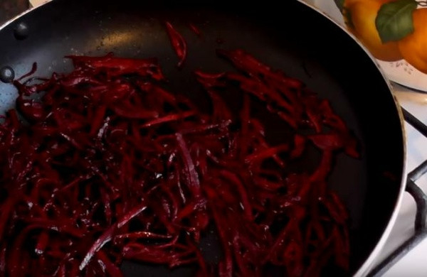 2. В сковороду наливаем растительное масло и разогреваем. Закладываем в первую очередь морковь, её томим пока она не даст свой цвет. Далее закладываем лук, обжариваем примерно минуту и отправляем в сковороду свеклу. Единственное, её заранее надо немного присолить, так она не потеряет цвет.