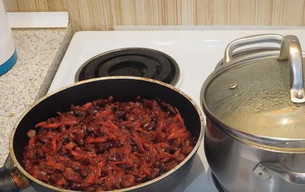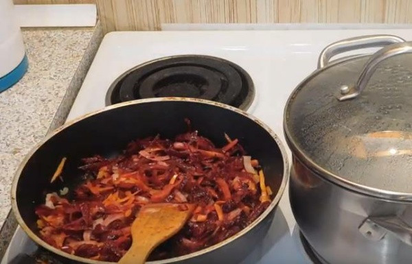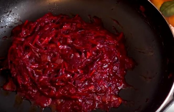 Добавлять пассерованную свеклу необходимо уже в момент, когда картофель сварился, потому что в заправке присутствует уксус, а картошка в кислой среде долго вариться и твердеет.