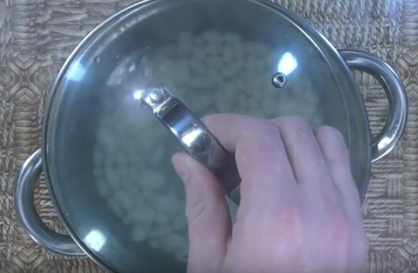 1. Ставим на плиту кастрюлю с водой (в нашем случае 3-х литровая) и всыпаем туда фасоль. Отправляем вариться. Кстати, бобы необходимо заранее замочить, желательно на ночь, чтобы они разбухли и быстрее сварились.