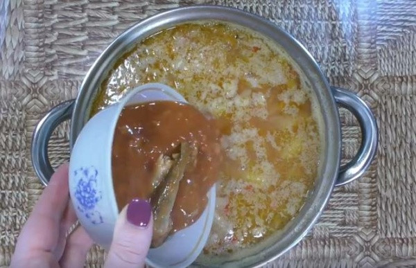 5. Когда всё сварилось можно добавлять последние продукты. Вносим в кастрюлю подготовленную заправку и кильку. Перчим, досаливаем, добавляем желаемые специи и перемешиваем. Даём борщу закипеть. Как только он закипит, отключаем газ, накрываем кастрюлю крышкой и даём настояться.