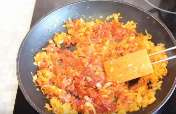 3. Следом закладываем томатную пасту, перемешиваем и жарим ещё минут 5-7. Если же овощи начнут пригорать, то добавьте ещё масла или водички. Готовую обжарку пока перекладываем в отдельную тару.
