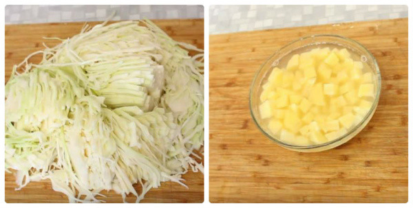 5. Берём капусту и мелко шинкуем. Следом её можно перемять с солью, чтобы она уменьшилась в объёме и её было легче закладывать в кастрюлю. На указанный объём овоща, хватит 1,5 ч. л. соли. С картофелем поступаем как нравится, можно его нарезать кубиком либо брусочками.