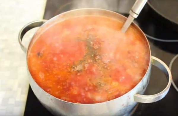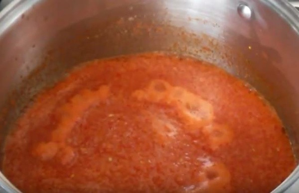 1. Перекрученные помидоры закладываем в кастрюлю. К ним добавляем растительное масло и ставим всё на печку. Доводим смесь до кипения.