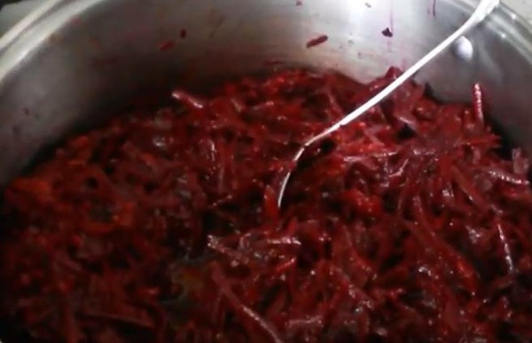 2. К закипевшим томатам отправляем натёртую свеклу и 50 мл уксуса. Всё перемешиваем. В таком виде заготовка должна прокипеть 10-15 минут. Огонь при этом должен быть средним.
