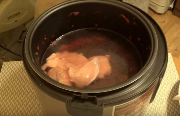 3. Теперь в чашу мультиварки наливаем приблизительно 1 л воды. Её можно не мыть после пассеровки. Закладываем туда куриные бёдра и варим их в режиме «суп» 30 минут. Если же Вы будете использовать другое мясо, то варить его придётся дольше. Для свинины или говядины придётся уделить более часа.