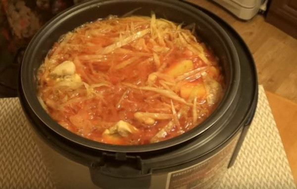 4. К сваренному бульону высыпаем нарезанный картофель и заранее отваренную фасоль. При необходимости доливаем воду до нужного объёма, но с учётом, что будут добавляться остальные ингредиенты. Оставляем вариться продукты под крышкой минут 15 (до готовности). За 5 минут до окончания таймера добавляем в чашу капусту. В завершении вносим в суп заправку, доводим его до вкуса (солим, перчим) и даём закипеть.