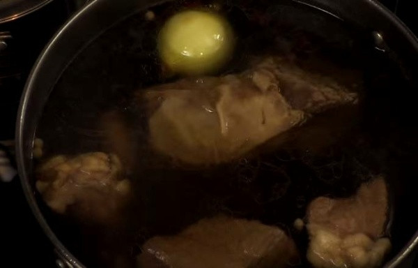 1. Приготовление борща начинается с бульона. Мясо можно брать любое, в нашем случае, это свиные рёбра. Наливаем пол кастрюли воды и туда закладываем 1 небольшую головку лука и рёбра. Ставим ёмкость на средний огонь и варим бульон.