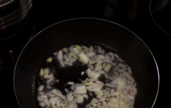 2. Пока основа доваривается можно заняться приготовлением заправки. На разогретую сковороду наливаем растительное масло и выкладываем мелко покрошенный лук. Обжариваем его до золотистости.