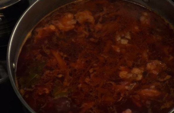 Если же Вы будете использовать красную фасоль, то лучше всего её отварить заранее, а потом добавить к борщу в самом конце. Просто при варке, красные бобы выделяют некрасивый цвет.