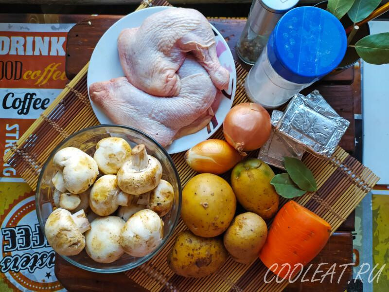 Изначально скажу, что продуктов я брал на трёхлитровую кастрюлю, то есть из представленного количества получится 2,5-3 л супа. Но если пожелаете готовить больше (4-5 л), то не обязательно увеличивать число ингредиентов. Например, мяса можно взять столько же, сырков и грибов тоже. Останется только сориентироваться по овощам.