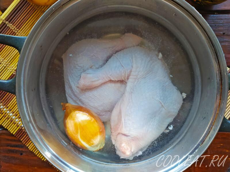 Заранее промываем куриные окорока, луковицу и кладём всё в кастрюлю. При этом овощ можно не очищать. Его шелуха поможет приобрести бульону красивый янтарный цвет.