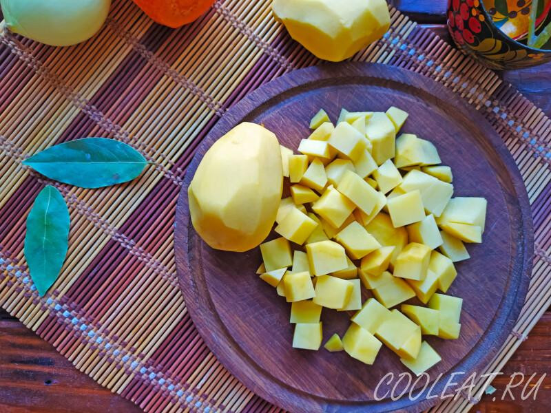 Шаг 2. Картофель нарезаем кубиком или другим удобным способом. Главное, не делайте куски слишком большими. Всё должно гармонировать с другими продуктами и легко помещаться в ложку.