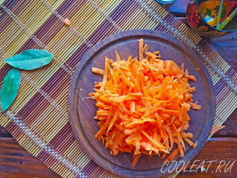 Шаг 3. Морковь в это раз я решил натереть на крупной тёрке. Хотя свободно можно нарезать всё небольшим кубиком или потереть на мелком сечении. Так будет даже красивее.