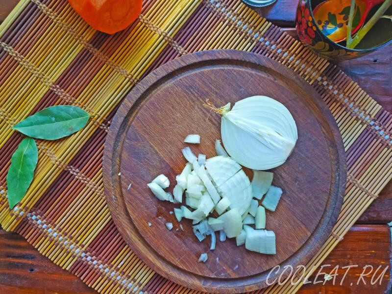Шаг 4. Лук измельчаем мелким кубиком. Но опять же – это не принципиально. Знаю, что некоторые режут четвертькольцами или крупными кусками. Тут всё зависит от предпочтений.