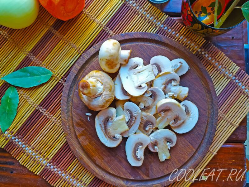 Грибы нарезаю пластинами, так они красивее смотрятся и лучше ощущаются в супе. При желании можете порезать продукт крупным кубиком – но не мельчите. Дело в том, что во время тепловой обработки шампиньоны значительно уменьшаются в размере. Соответственно, слишком мелкие фрагменты совершенно не ощутятся в гуще блюда. На случай маленьких грибочков – их вовсе вносите целыми.