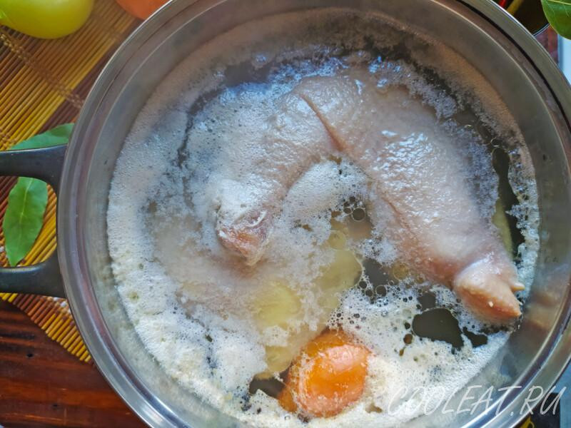 Шаг 6. Ну а пока мы подготавливали овощи, наш бульон начал закипать и на его поверхности образовалась пенка. Её снимаем при помощи шумовки или обычной столовой ложки. После этого можно продолжать варку, но при этом огонь делаем ниже среднего и уже полностью закрываем тару крышкой.