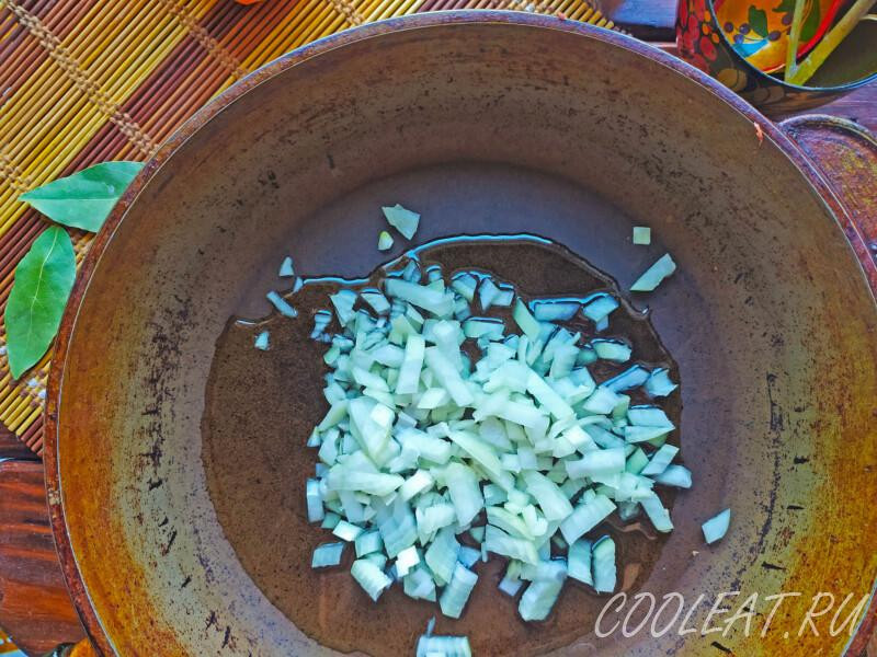 Шаг 7. Теперь займёмся пассеровкой. Наливаем в сковороду растительное масло, разогреваем его и первым отправляем обжариваться лук. Почему его? Потому что он дольше всех отдаёт свои ароматы в масло.