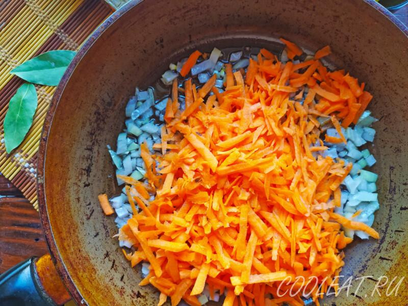 Шаг 8. Следом за луком в сковороду попадает морковь. Перемешиваем всё содержимое тары и оставляем пассероваться минуты 3-4, почти до полной готовности морковки.