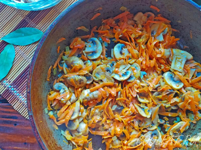 Шаг 10. Настало время к пассеровке добавлять шампиньоны. Их также смешиваем с другими овощами и обжариваем на среднем огне.