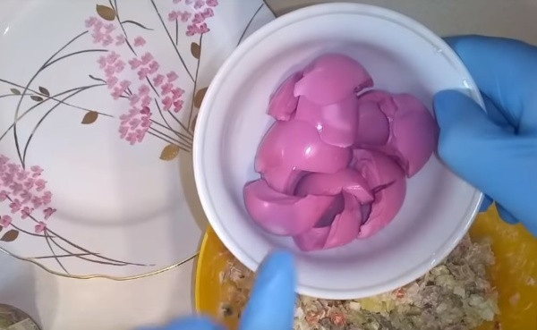 2. Отварные яйца чистим и отделяем от них желток, а белок погружаем в приготовленный краситель, чтобы они стали розовыми. Используйте для этих целей только 4 яйца, оставшиеся 2 пойдут в сам салат.