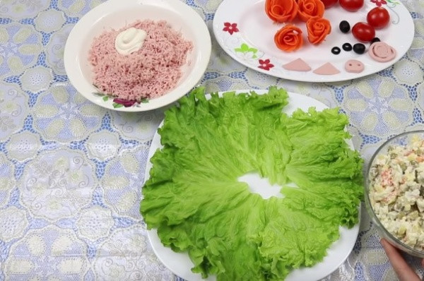 4. Приступаем к формированию самой свинки. В первую очередь застелите тарелку, где будем формировать салат, листьями салата.