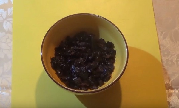 1. Чернослив заливаем кипятком минут на 15, а после нарезаем мелким кубиком.