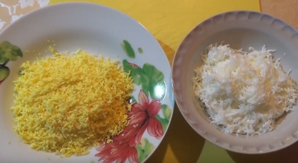 2. Яйца отвариваем и даём им остыть. Остывшие яйца чистим и разделяем на белок и желток, одни и другие трём на мелкой терке в разные миски. С сыром поступаем аналогичным образом.