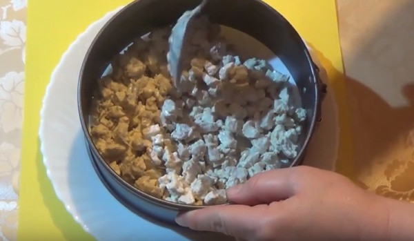 4. Отварное куриное филе нарезаем мелким кубиком и смешиваем с двумя столовыми ложками майонеза. Выкладываем первым слоем в разъёмную форму.