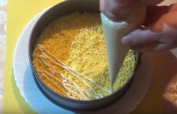5. Следующим слоем мы выкладываем яичный желток, распределяем его по всей поверхности и смазываем майонезом.