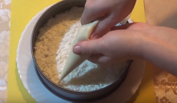 Чтобы Вы понимали мы будем использовать 6 коржей, именно поэтому мы выкладываем всего половину начинки. Получается у нас будут слои повторятся ещё 1 раз.