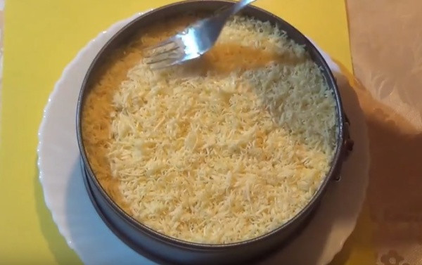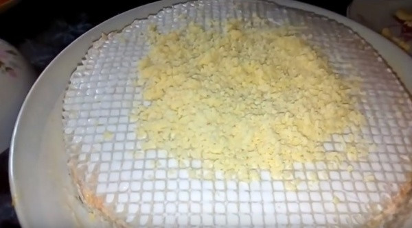 6. Украшаем. Покрашенный белок трём на мелкой тёрке и наносим его на основу салата.