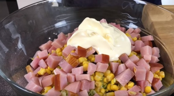 5. Теперь надо ещё в общее блюдо добавить консервированную кукурузу и майонез, и всё тщательно перемешать.