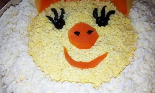 8. Осталось нам создать мордочку свинки. Яйца разделяем на желтки и белки. Первые мы натираем на мелкой тёрке прямо на салат образовывая круг посередине.
