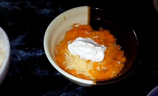 3. Приступаем к третей начинке. Берём 1 отваренную морковь и натираем её на мелкой тёрке, к ней также натираем твёрдый сыр и заправляем всё майонезом, достаточно будет 2-х ст. л.