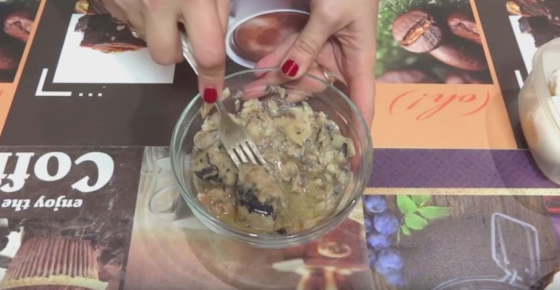1. Первым делом перекладываем сайру в отдельную тарелку, масло при этом оставляем в банке, и переминаем её вилкой. До состояния пюре доводить продукт не надо, достаточно, чтобы рыба разделилась на волокна. Кости также мнём.