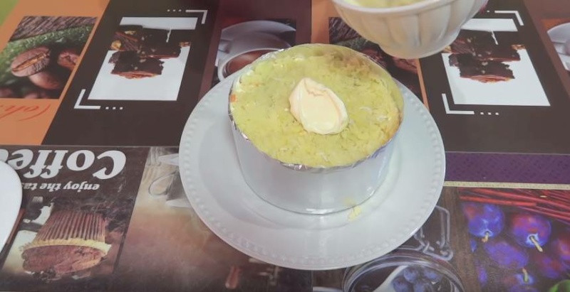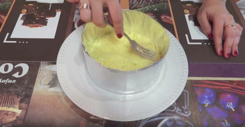 5. Ну вот мы и подошли к сборке Мимозы. Устанавливаем на тарелку сервировочное кольцо или разъёмное кольцо для выпечки и начинаем собирать. Единственное, форму лучше обмотать изнутри пищевой плёнкой, так всё проще будет отставать при снятии.