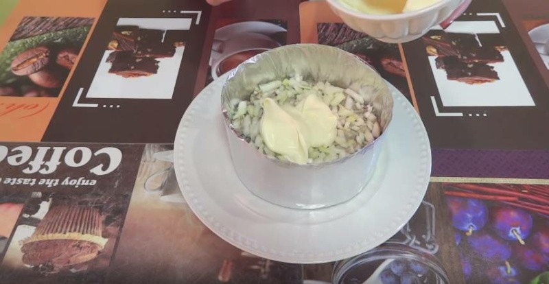 4. Далее берём варенные яйца и отделяем желтки от белков. Последнее натираем на крупной тёрке прямо на первый слой. Также всё равномерно распределяем и промазываем тонким слоем майонеза.