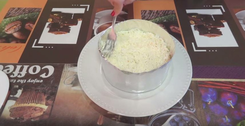 2. Теперь начинаем собирать блюдо. На тарелку первым слоем отправляем рис и придаём ему желаемую форму, в нашем случае это просто круг. Далее сверху наносим майонез и размазываем его по всей поверхности.