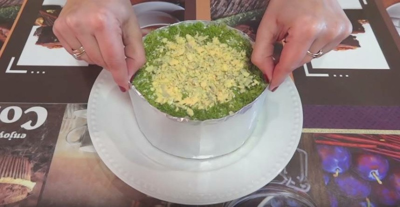 6. Заключительный слой состоит из яиц. Белок укладываем посередине, но не задевая края. Их мы посыпаем натёртым желтком, только не всем. Оставьте совсем чу-чуть для оформления веточек. Таким образом создаётся очень необычное украшение для салата.
