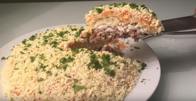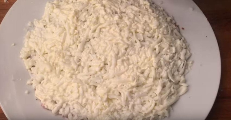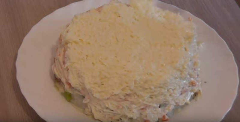 Готовому салату будет достаточного 1 часа, чтобы пропитаться, потому что продукты мы натирали на мелкой тёрке. Настоятельно рекомендую приготовить такой рецепт, особенно если никогда не пробовали добавлять слой из сыра.