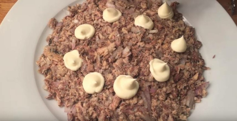 3. Выкладываем на общее блюдо подготовленную сайру – это будет у нас первый слой. Распределяем её по желаемой форме, а сверху промазываем тонким слоем майонеза. Только не добавляйте его слишком много, т. к. консерва и так уже сочная.