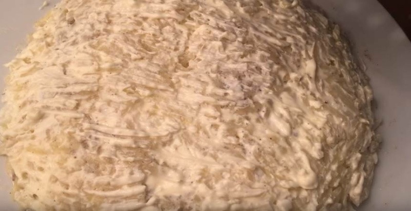 5. Отварной картофель трём следующим слоем. Придаём ему форму и немного подсаливаем. Смазываем майонезным соусом. Только на этот раз его можно добавить поболее, т. к. картофелю надо хорошо пропитаться.